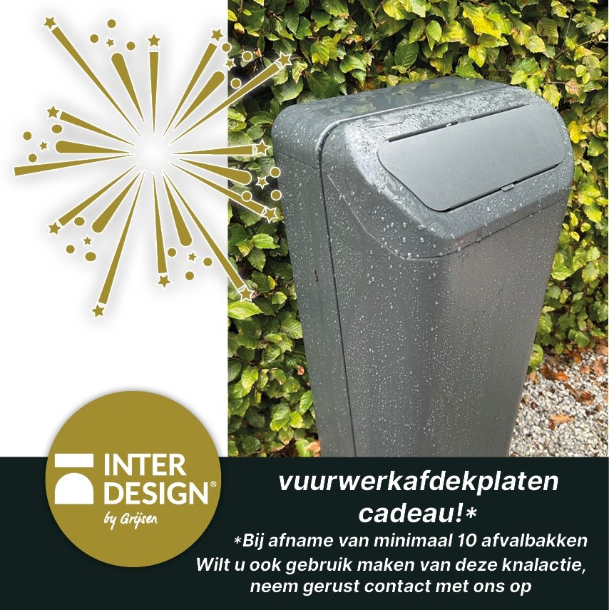 De Dulce afvalbak 70L is net wat ruimer dan de 50L versie. Plaatsing is mogelijk op een designvoet of in een beugel maar ook aan een paal of muur. Kies een binnenbak of plasticzakhouder en evt. extra opties als bv. een inworpverkleiner of een vuurwerkafdekplaat.