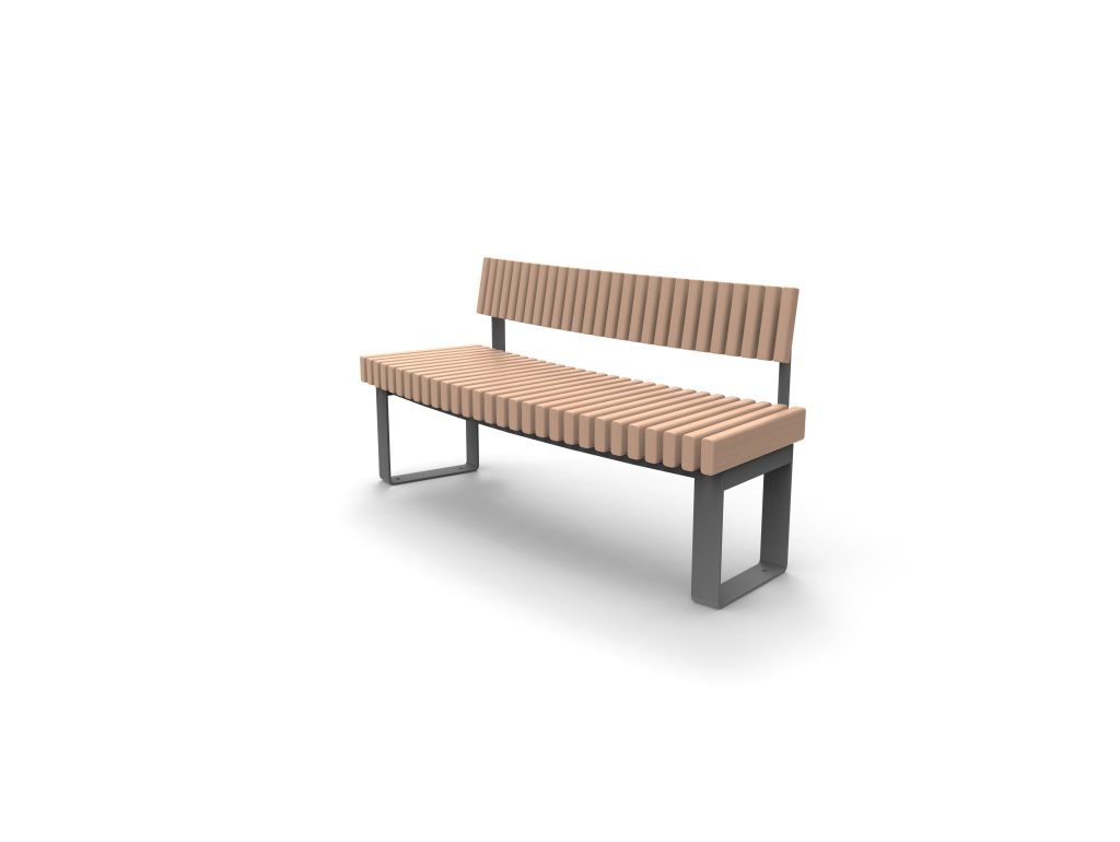 Affinité – Stijlvol en modulair straatmeubilair van hout en staal. Rechte of gebogen banken, met of zonder rugleuning, voor een comfortabele en uitnodigende openbare ruimte.