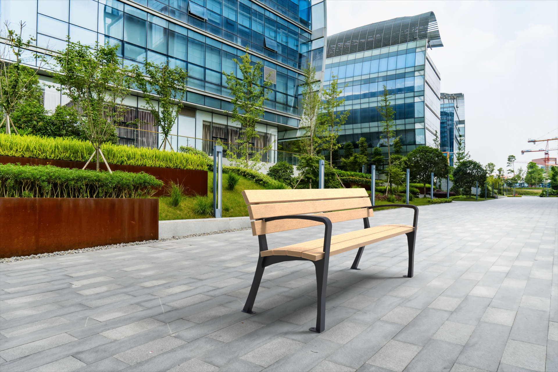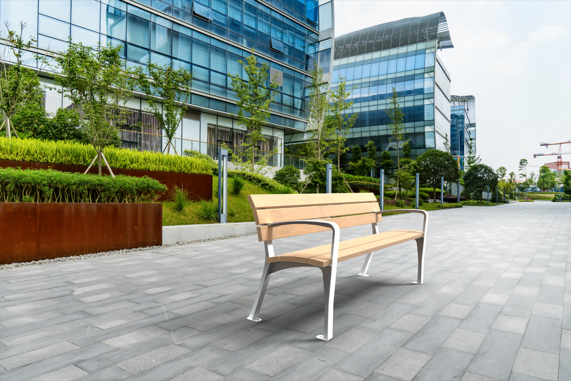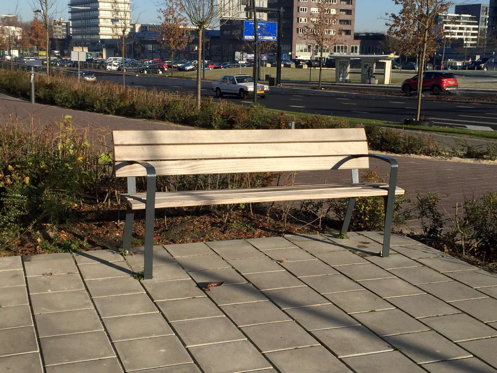 De rugleuning, een slank en elegant stalen frame, samen met het licht gebogen zitvlak, maakt deze LATHS bank met rugleuning een unieke comfortabele parkbank.