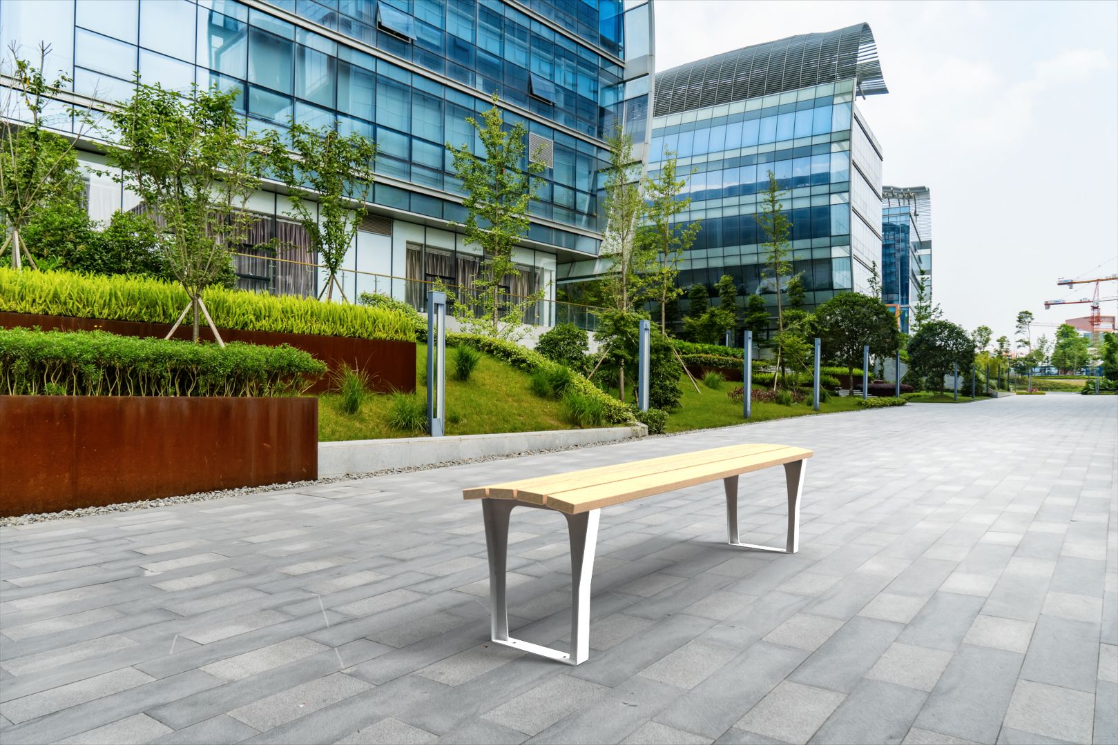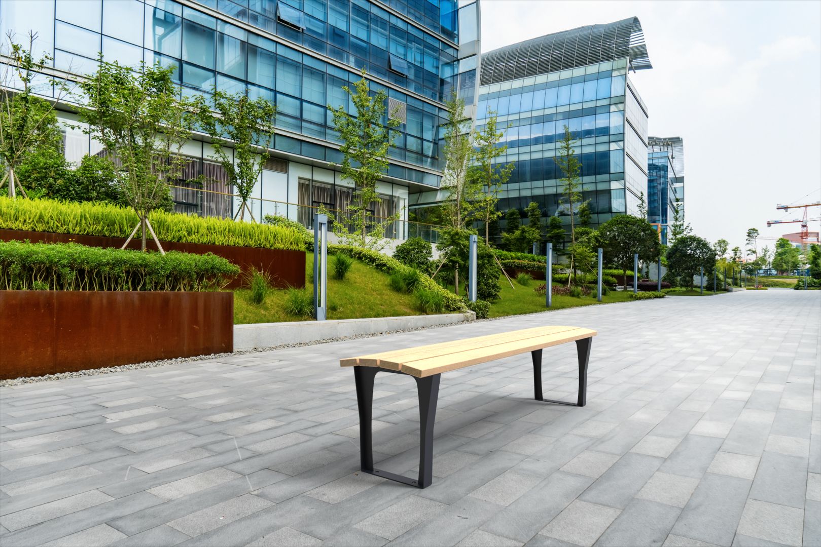 Een slank en elegant stalen frame, samen met het licht gebogen zitvlak, maakt deze LATHS parkbank zonder rugleuning tot een fijn bankje om even te gaan zitten.